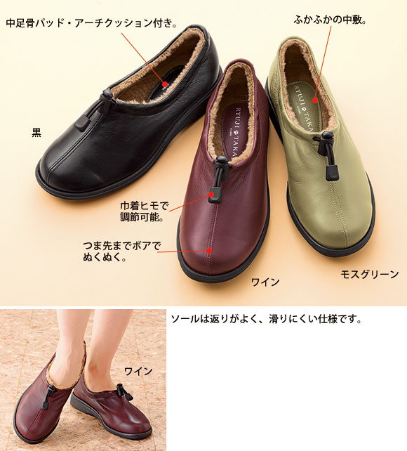 スポッと足を入れた瞬間、すぐに自分の足に馴染む、まるで巾着のような5Eラクラクシューズ。内部はつま先までボアを使い、ストッキングで履いても足に路面の冷たさを感じさせません。パンツに、またスカートに、ボトムを選ばない愛らしい一足です。