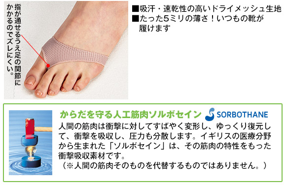 外反母趾にお悩みの方、つま先の裏が硬くなり歩くのがつらい方、ご注目ください。この足裏サポーターを着ければ、ふかふか人工筋肉「ソルボセイン」が指のつけ根への衝撃をたちまち軽減。わずか5mmの薄型設計ながら足裏にかかる圧力を吸収、分散して快適歩行へ。爽やかなドライメッシュ生地を使用し、不快なムレを防ぎます。