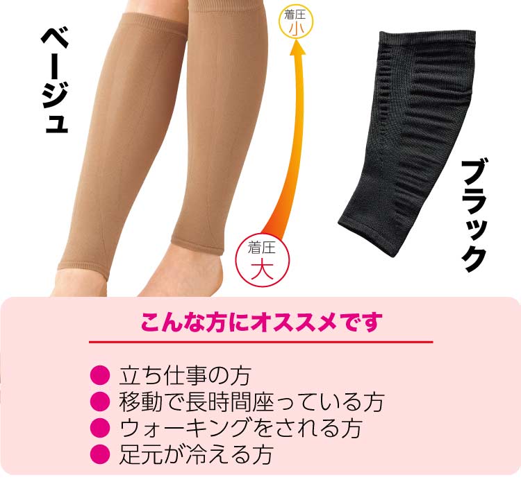 ふくらはぎに血液が溜まって起こるだるさとむくみは、ひどくなると静脈瘤の原因に。こちらの医療用サポーターは、特許技術のナノテク繊維を使用。足首からふくらはぎにかけて徐々に着圧を弱くすることで、静脈血の血行を促進。むくみを軽減・予防します。