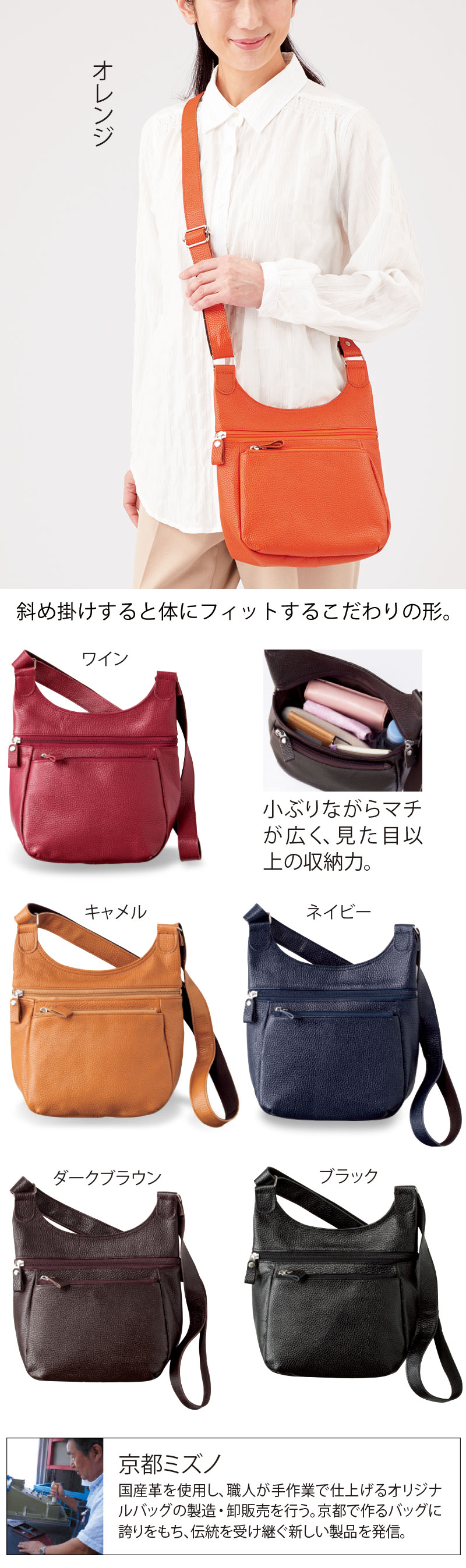 高品質で柔らかく耐久性に優れたこだわりの姫路産レザーを使用し、京都の職人が手仕事で仕上げた牛革のショルダーバッグ。斜め掛けすると体に程よくフィットし、幅広いシーンで活躍します。
