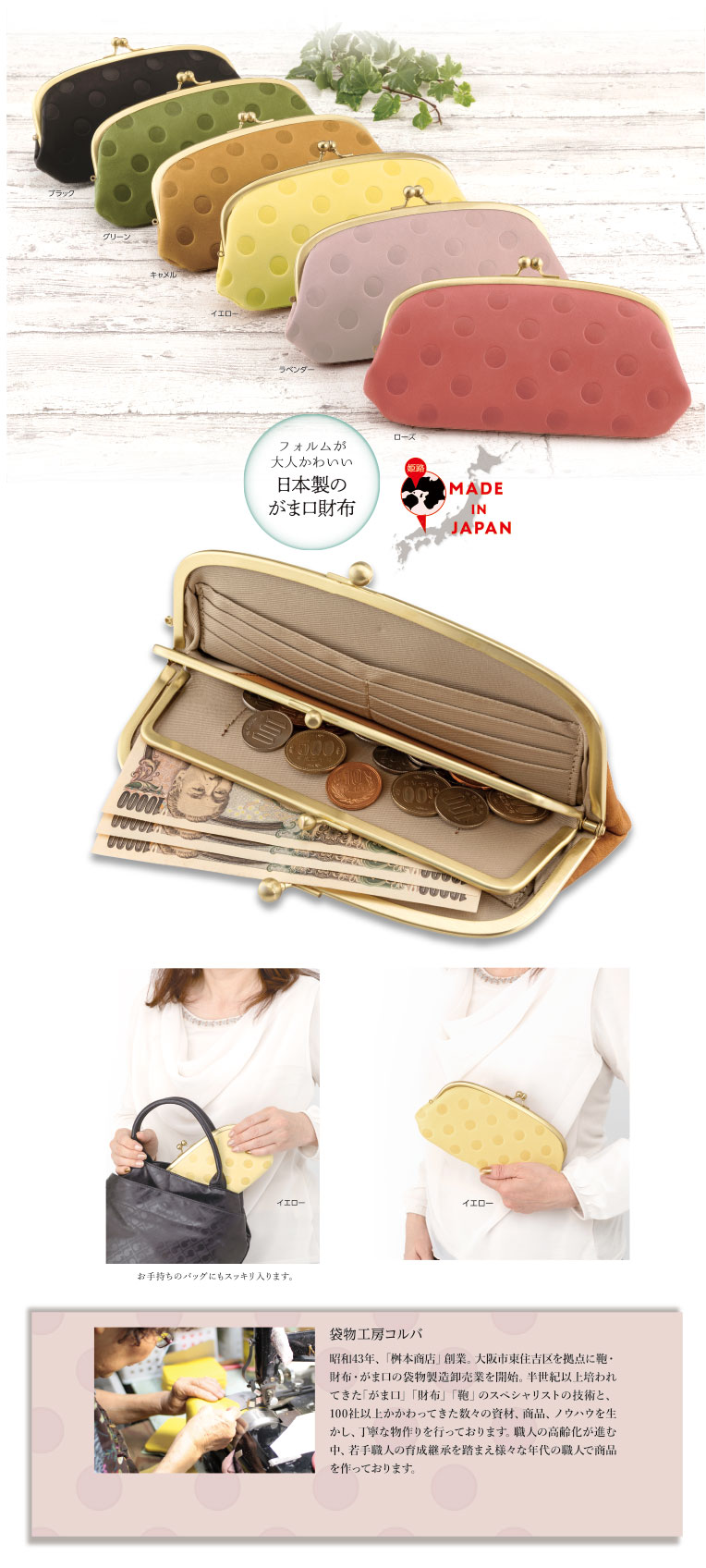 2室式の親子がま口で、中側にも口金式小銭入れがあります。姫路牛革に水玉模様を型押しし、手ざわりも心地よい、安心の日本製。