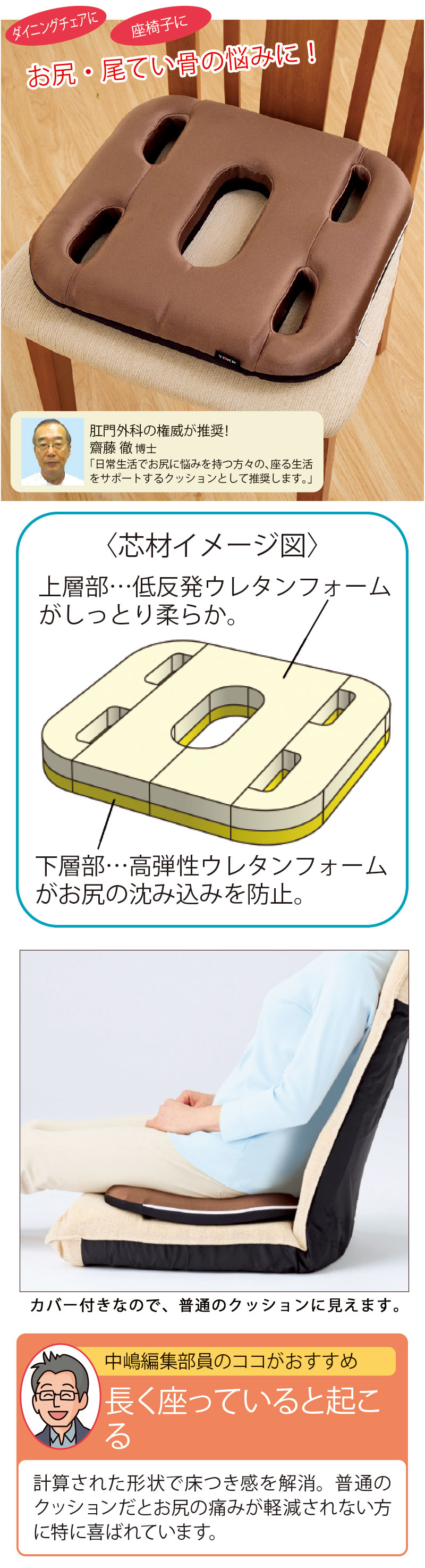「臀部の筋肉がやせ、座るのがツライ」という方、痔疾、腰痛、車いす、床ずれなどお尻や腰に悩みをかかえる方々をサポートするクッションです。通気性と着座時の安定を考えた大小5つのホール形状。2種のウレタンを重ねて、座り心地はよく、血流をさまたげないように作りました。床つき感がなく、体を確実に支え、座姿勢を安定させてくれます。