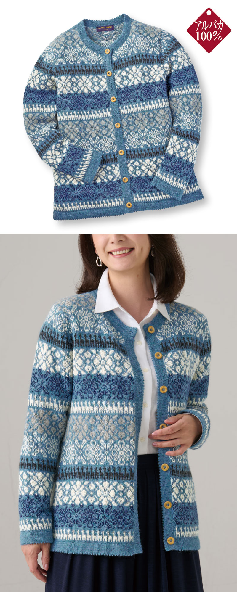 エレガントな雪の結晶柄にアルパカモチーフで愛らしさを添えたカーディガン。アルパカ100%のふんわりした軽さとたっぷりの暖かさで、寒さを感じたらさっと羽織れます。