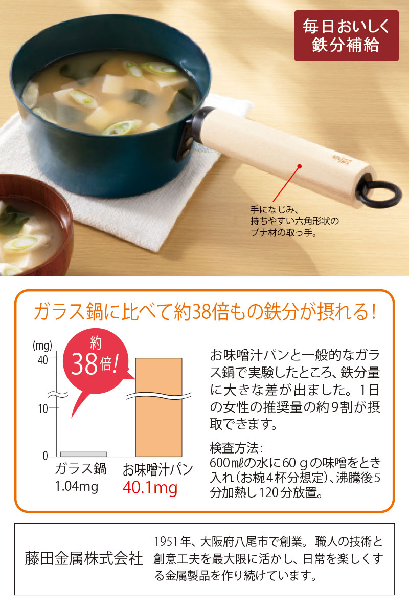 食生活で不足しがちな鉄分を無理なく継続して摂るために、毎日食べる味噌汁に着目して作られた鉄鍋です。味噌汁作りにちょうどいいサイズやお手入れしやすさにもこだわりました。